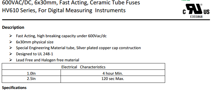 6x32mm, 600V直流, 出色的分断特性为仪表误操作提供了良好防护.