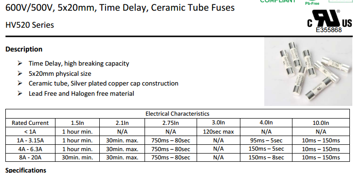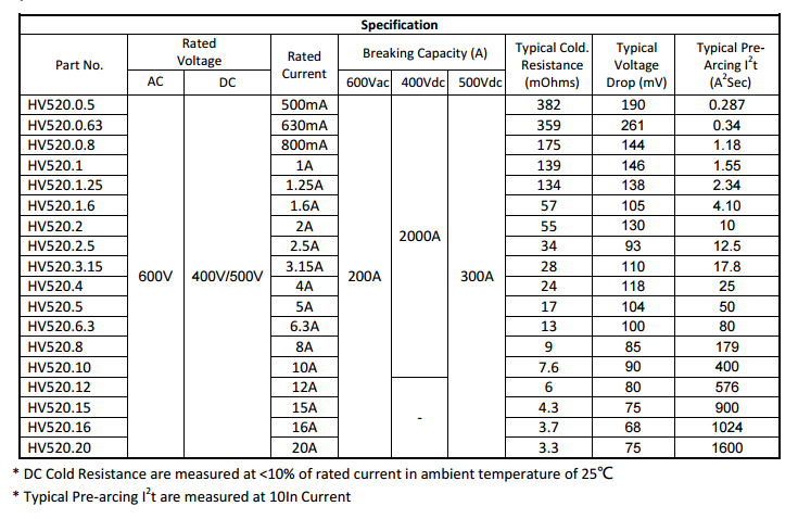 熔断器HV520 600VAC 400/500VDC 500mA-20A 索取樣品